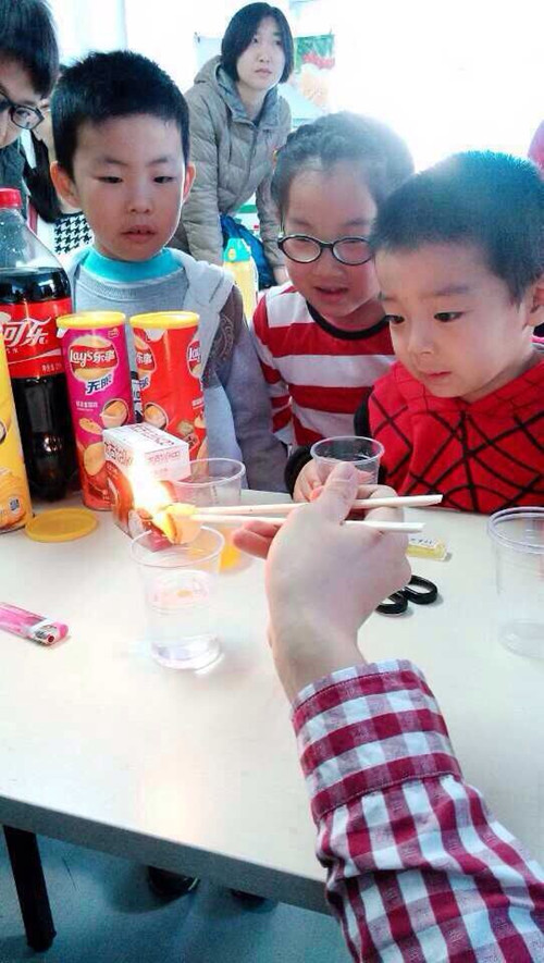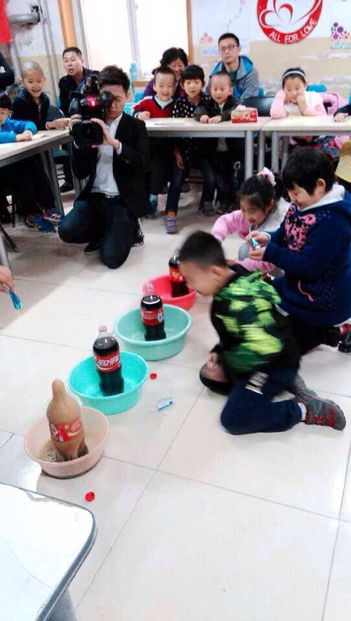 小朋友們在可樂中放入了幾顆神秘物體,只見樂可瞬間噴射出來,小朋友和家長的驚呆了。
