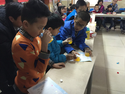 老師將事先調(diào)配好的果汁和從市場購買的果汁讓家長和小朋友們用感官來鑒別,猜錯的還真不少。