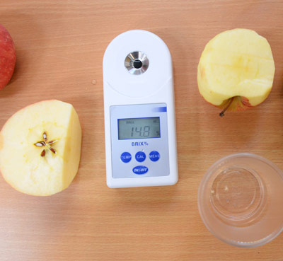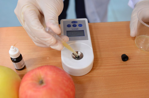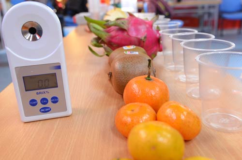 北京智云達技術工程師楊老師和王老師首先將水果去皮榨汁,不加水,再通過使用北京智云達自主研發生產的快速檢測產品:數顯糖度儀,對樣品溶液的糖度進行檢測。