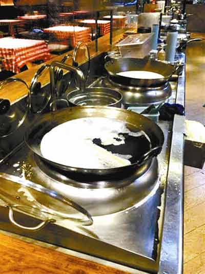 “廚房是開放式的,透過玻璃窗看見他們就那樣在鍋里涮抹布?!碧岬?8日晚自己看到的情形,于女士仍有些生氣。于女士告訴北青報記者,28日晚8點50分左右,曾在王府井大街北京APM購物中心的“西貝莜面村”店內就餐,“當時店里的員工說他們是晚上9點‘閉餐’,不能加菜了,然后店里有不少服務員正在打掃衛生?!庇谂炕貞?,因為店內的廚房是透明玻璃窗、朝著店內的,“吃飯時就看到廚房里有一個廚師把擦玻璃的抹布放在平時炒菜的鍋里涮?!庇谂砍鍪玖水敃r自己拍下的幾張圖片,其中一張圖片中顯示,兩口炒菜鍋內盛放著帶有泡沫的液體,其中一口鍋內還泡著沾有油漬的抹布。