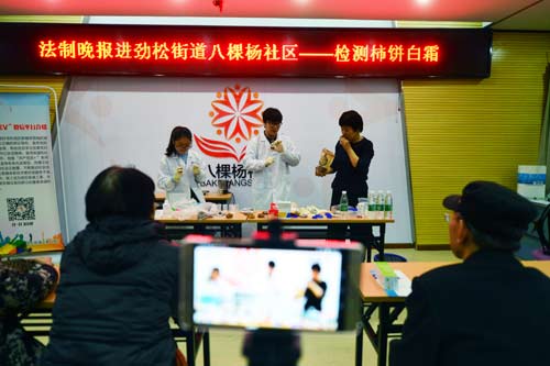 2016年12月08日9:00,北京智云達科技股份有限公司(以下簡稱“北京智云達”)與法制晚報攜手制作走進勁松街道八棵松社區活動,為消費者免費檢測柿餅中是否含有葡萄糖和果糖、柿霜中是否含有淀粉。