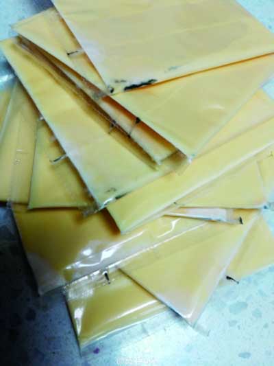 “正月初三的時候,我在超市內(nèi)購買三元芝士片,正好趕上超市有活動,買兩袋贈送了一袋。”果女士稱,將商品拿回家之后,她就將芝士片放在了冰箱里,一直沒有拿出來。“冰箱一直沒有斷電,都是正常制冷的。”她稱,直到昨天,她從冰箱內(nèi)將芝士片拿出來準(zhǔn)備食用,卻發(fā)現(xiàn)一個袋子中的芝士片已經(jīng)發(fā)霉了。“發(fā)霉的芝士片是贈送的那一袋,里面的每一片都有一片綠色霉點。其他兩袋是正常的,沒有壞。我觀察霉變的芝士片上都有一道黑線,黑線的一側(cè)都有霉菌,要是我不小心吃到肚子里,肯定是要鬧肚子的。”