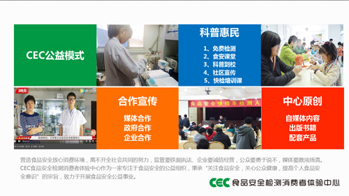 CEC體驗(yàn)中心針對(duì)社會(huì)熱點(diǎn)以及常見(jiàn)食品安全問(wèn)題,與中央電視臺(tái)、英國(guó)BBC、黑龍江電視臺(tái)、北京電視臺(tái)、河北衛(wèi)視等多家電視臺(tái)合作拍攝近百場(chǎng)科普節(jié)目。與法制晚報(bào)、騰訊大燕網(wǎng)合作進(jìn)行直播,從生活中常見(jiàn)的食品安全熱點(diǎn)問(wèn)題出發(fā),對(duì)網(wǎng)上流傳較廣的信息進(jìn)行實(shí)驗(yàn)驗(yàn)證,將謠傳和誤傳擺上實(shí)驗(yàn)臺(tái),用真實(shí)的實(shí)驗(yàn)數(shù)據(jù)粉碎食品安全謠言。此外還參加低碳大篷車(chē)科普活動(dòng)以及遠(yuǎn)赴非洲送去水質(zhì)檢測(cè)設(shè)備的公益活動(dòng)。