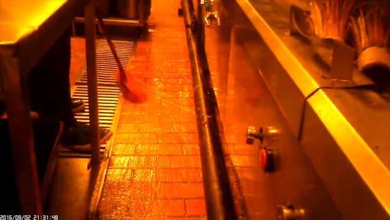記者隨即被分配到廚房做一名配菜員,負責配置醬料和菜品原料。記者發現,廚房墻面和地面常常積累了污水和油漬,為了保潔,廚房師傅便不定期對墻面和地面進行刷洗和清掃,而在清掃之后,廚房師傅竟將掃把放入用于做菜的鍋內進行漂洗。見記者表情驚訝,旁邊的一名廚房師傅不以為然地說:“這里本來就是掃把洗鍋?。 ?