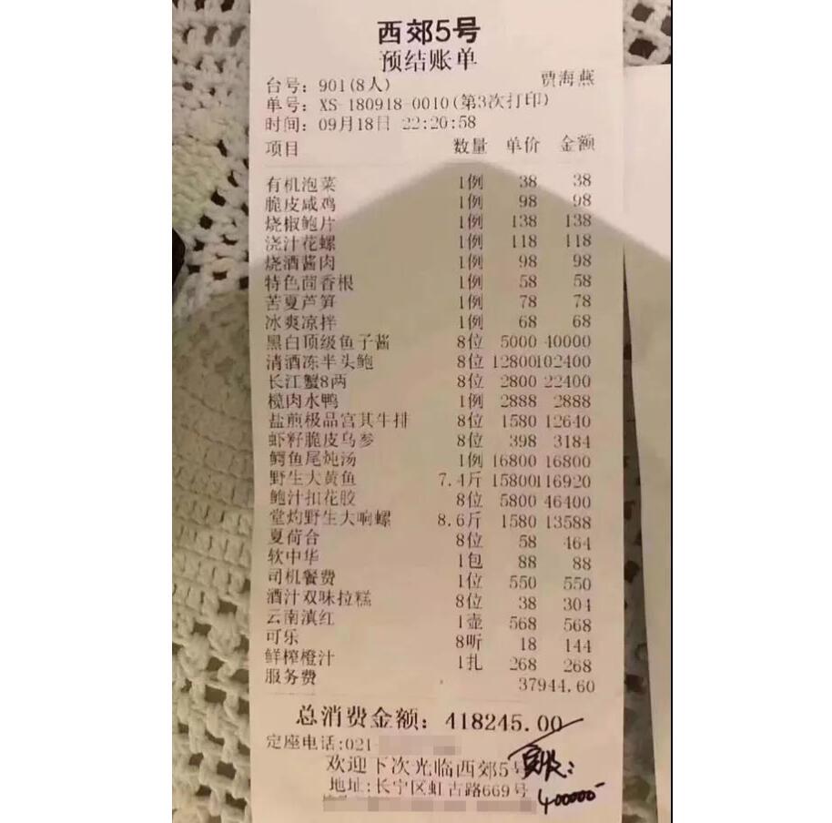 菜單中,另包含550元的司機餐,以及將近3.8萬元的服務費,總價共計418245元,賬單右下角有手寫標注“實收”40萬元。