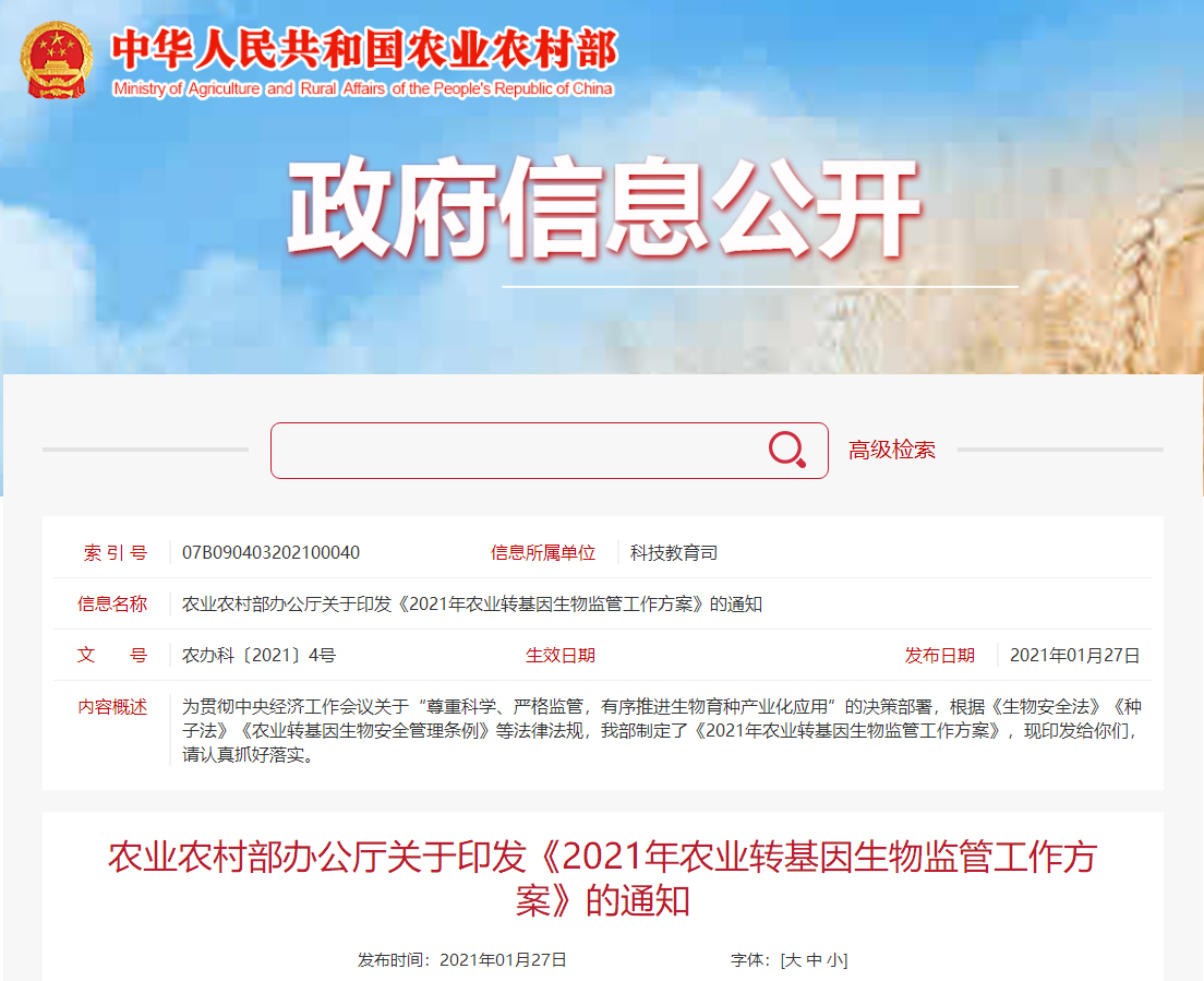 各省、自治區、直轄市農業農村(農牧)廳(局、委),新疆生產建設兵團農業農村局: 為貫徹中央經濟工作會議關于“尊重科學、嚴格監管,有序推進生物育種產業化應用”的決策部署,根據《生物安全法》《種子法》《農業轉基因生...[詳情]
