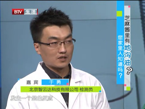 為了證實購買的造假芝麻醬上面含有的一層浮油是否為地溝油,《生活面對面》欄目特邀北京智云達科技有限公司