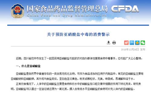 近期,四川省巴中市發生了一起因誤用亞硝酸鹽引起的農村自辦群體性宴席食物中毒事件,造成2人死亡。對此,食藥監總局發布消費警示,提示廣大公眾警惕亞硝酸鹽中毒。