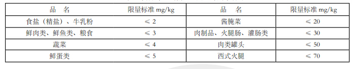 表1 食品中亞硝酸鹽限量的國家標準