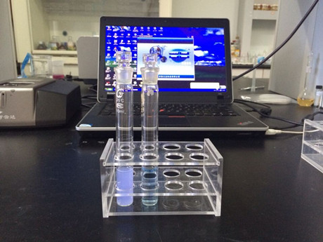 2、樣品管:取1mL樣品液于10mL比色管中,加入4mL顯色劑,搖勻,靜置30min,離心,上清液用微孔濾膜過濾到比色皿中。