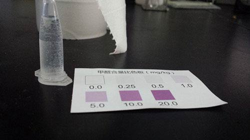 (3)結果:顏色相同或相近的比色卡色階示值為無色液體樣品中甲醛含量mg/L;顏色相同或相近的比色卡色階示值乘以10即為固體樣品中甲醛含量mg/kg。若顏色超出色