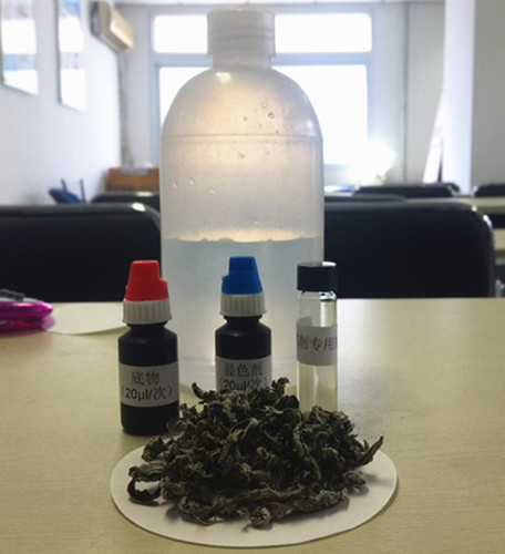 在離心管中,用移液槍依次加入4 mL緩沖液,20 μL顯色劑和50 μL酶,搖勻,靜置10 min。然后用移液槍加入20 μL底物。搖勻后立即轉移到比色皿中,放入儀器(通道1)。