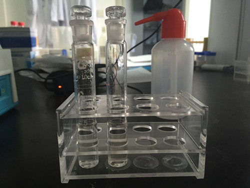 1、樣品管:取0.4 mL樣品液于10 mL比色管中,加B溶液1 mL、C溶液0.2 mL,混勻,加D溶液0.4 mL,搖勻,再加E溶液0.4 mL,立即用蒸餾水稀釋至5 mL刻線,搖勻,靜置20 min,進行檢測。