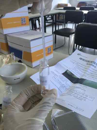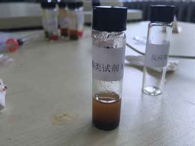 上下顛倒混勻約30秒,靜置。用0.5mL塑料吸管吸取上層樣品處理液,放于反應管中,滴加3-5滴試劑C,靜置觀察結果。